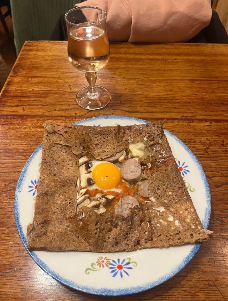 Dans la première j’ai opté pour une crêpe au lard fumé, œuf, champignon et poireaux, mon coup de cœur, vraiment! Dans la deuxième crêperie c’était saucisse œuf et champignon. Les 2 étaient au sarrasin.