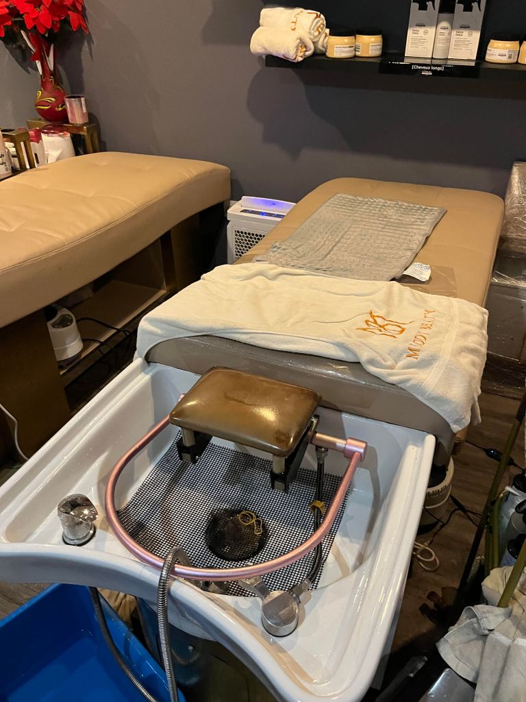 Le soin ! On en parle? Allongées sur le dos, dans une position des plus confortables du monde, on vous fait le shampooing des cheveux avec un massage surprise! Ça change des salons classiques français où on est mal positionné avec des douleurs aux cou